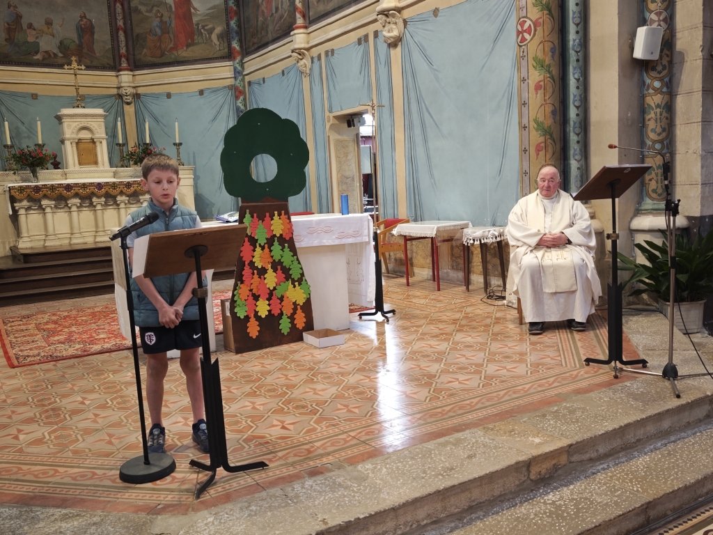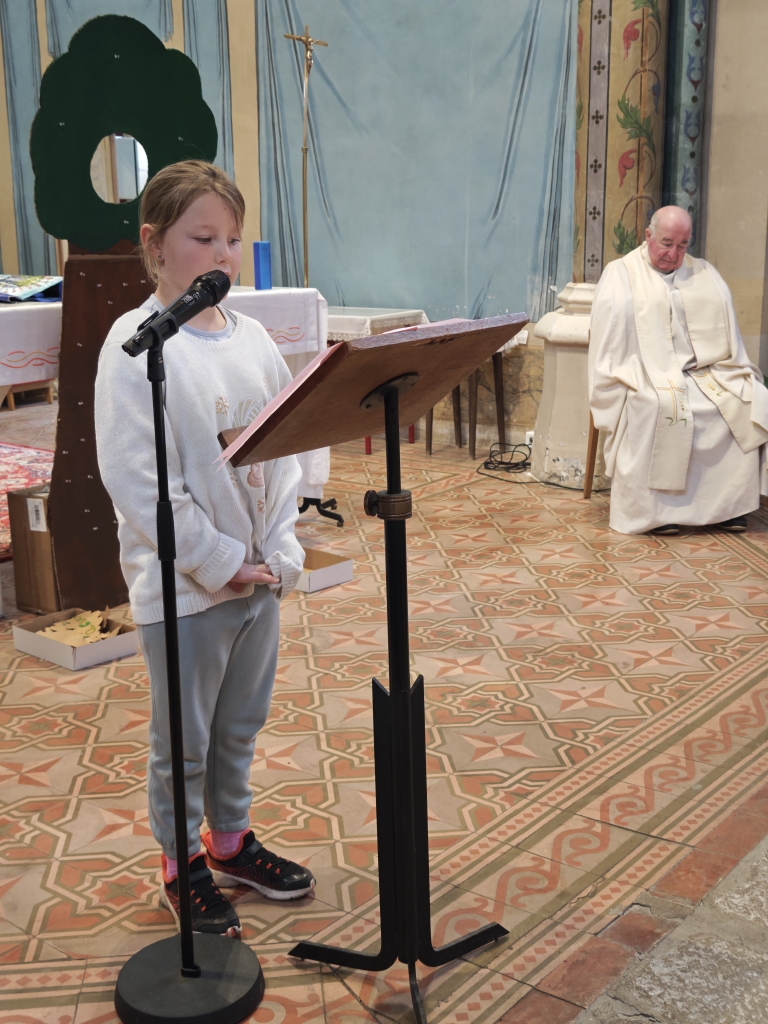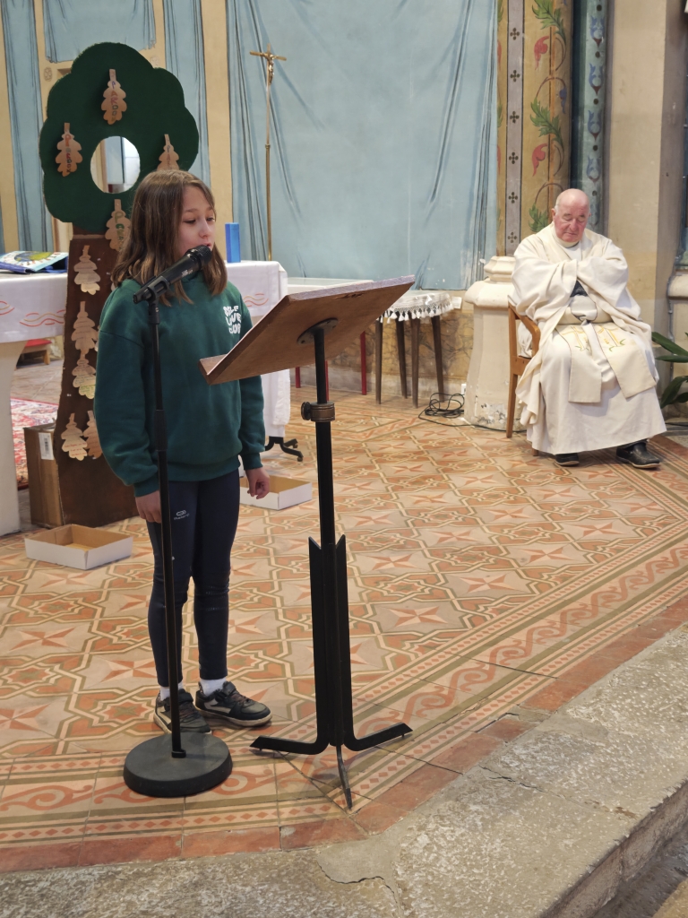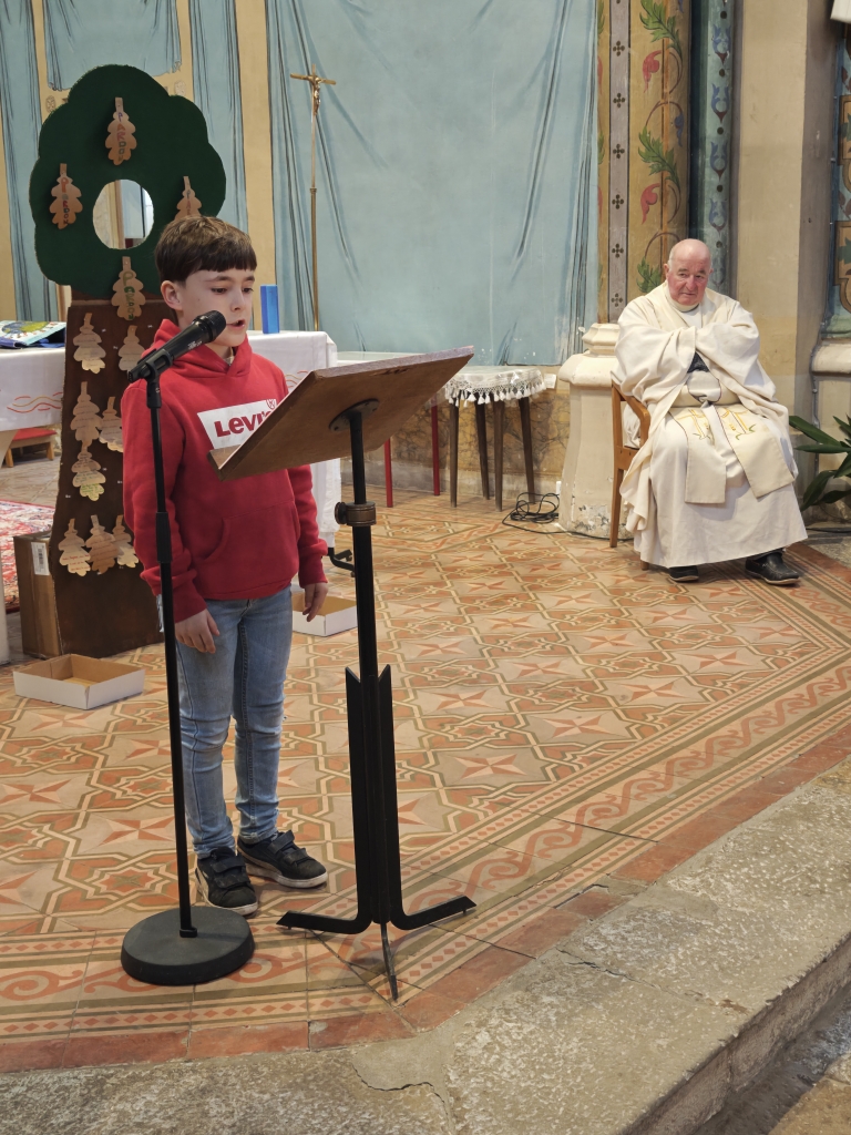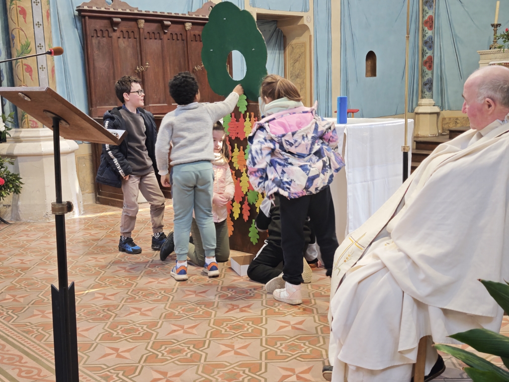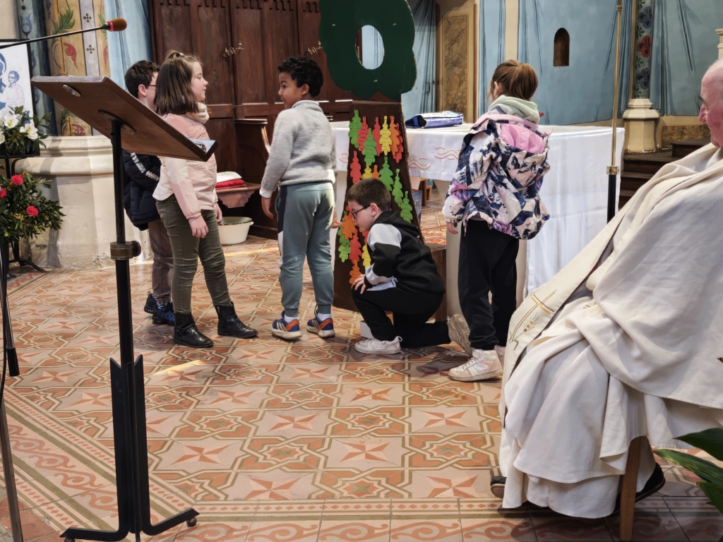 La célébration s’est ouverte autour d’un symbole fort : un arbre avec des feuilles mortes. Sur chacune d’elles, les élèves avaient inscrit des messages de pardon. Ces paroles ont été lues par les enfants, avant que les élèves de CP ne viennent enlever les feuilles, symboles du passage du pardon pour faire grandir la paix dans nos cœurs et autour de nous.