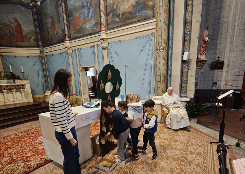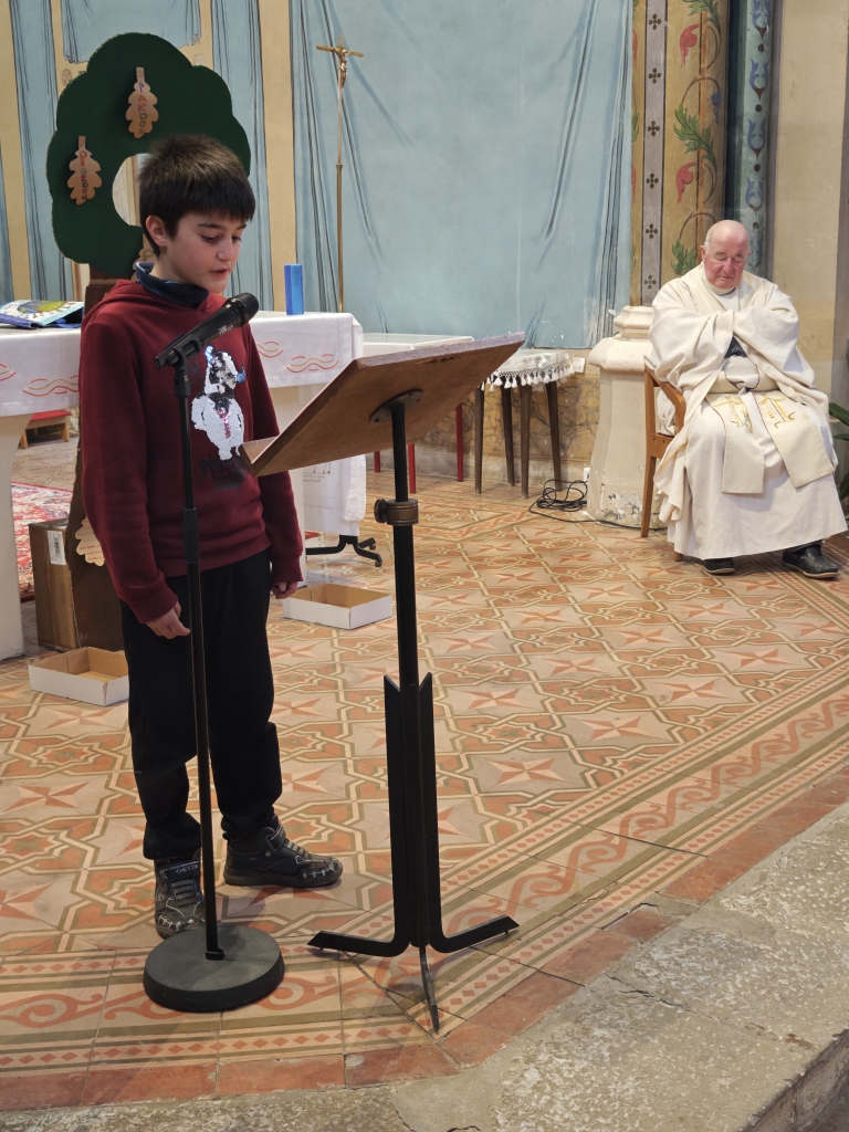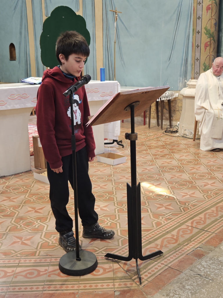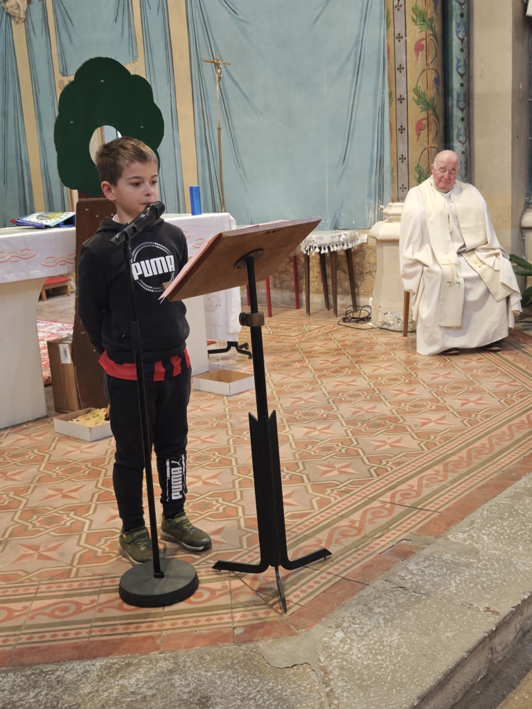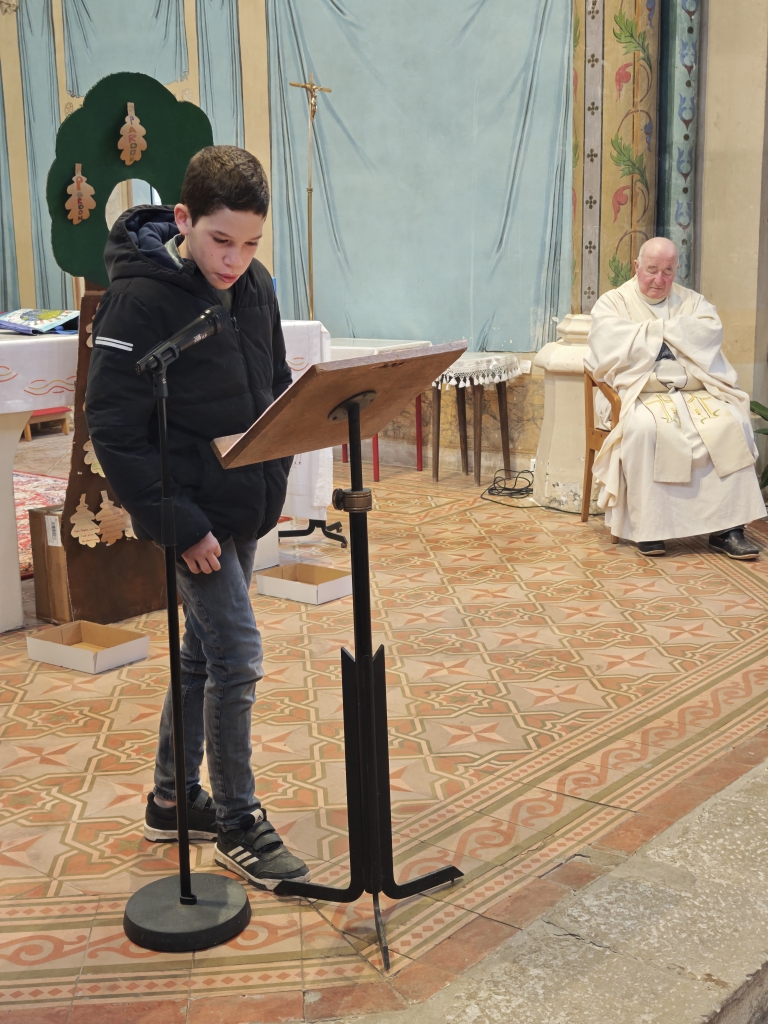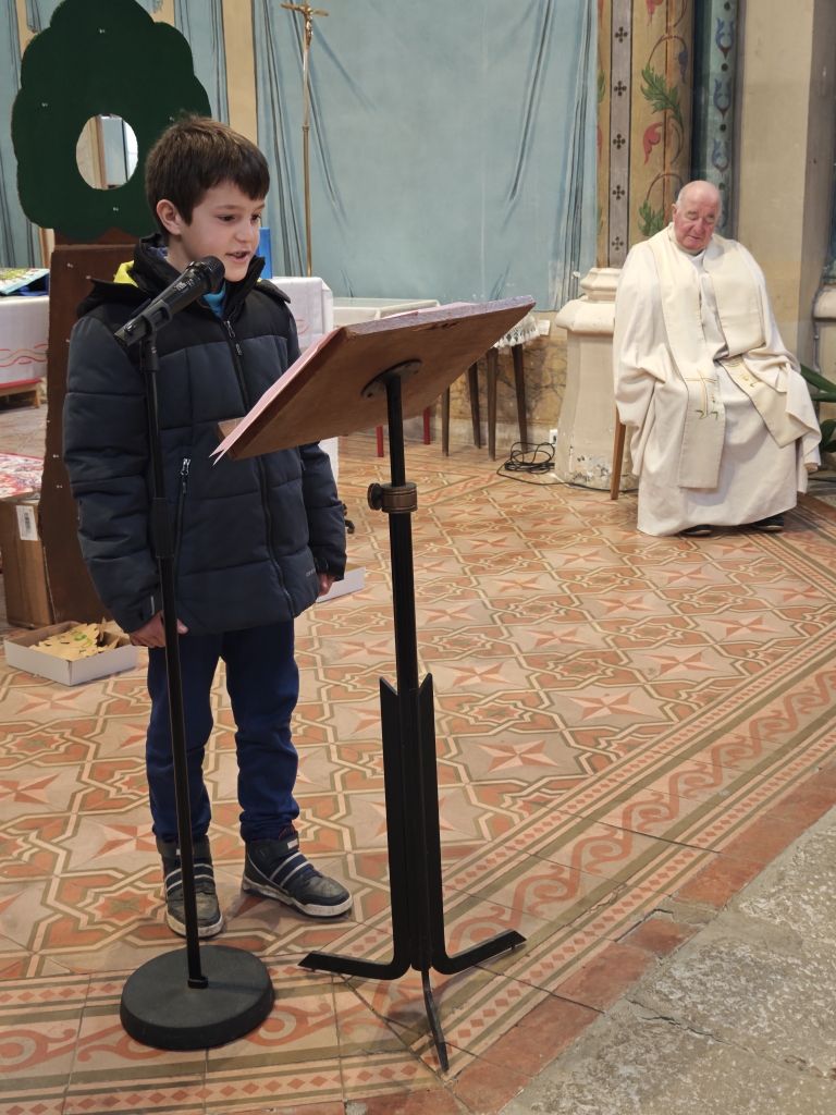 La célébration s’est ouverte autour d’un symbole fort : un arbre avec des feuilles mortes. Sur chacune d’elles, les élèves avaient inscrit des messages de pardon. Ces paroles ont été lues par les enfants, avant que les élèves de CP ne viennent enlever les feuilles, symboles du passage du pardon pour faire grandir la paix dans nos cœurs et autour de nous.